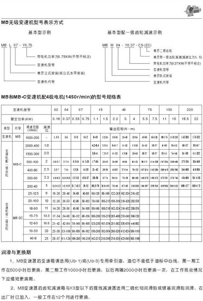 MB無(wú)級(jí)變速機(jī)型號(hào)表示法MB和MB-C變速機(jī)配4極電機(jī)(1450r/min)的型號(hào)規(guī)格表潤(rùn)滑和更換期
